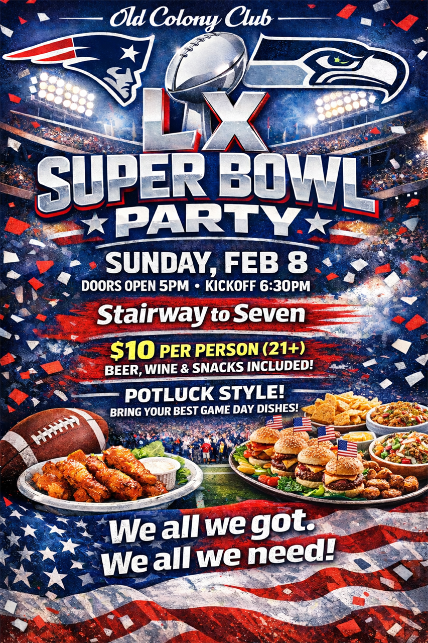 Members of the Old Colony Club gathered at the club house to watch the New England Patriots attempt a seventh trophy win.  Although it was not to be, OCC members enjoyed the gathering and pot luck dining.  Photos of the event are included below.